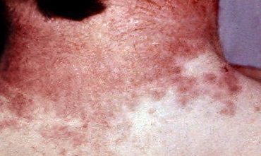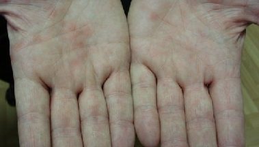 Когда болезнь переступает 2-4 недельный рубеж, появляется сыпь на теле, которая представляет собой мелкие красные точки. В большинстве случаев такие высыпания проходят спустя 7 дней, а после своего исчезновения оставляют следы в виде чешуйчатого шелушения.