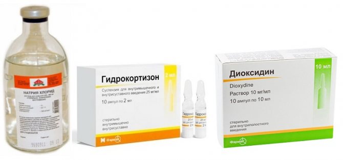 Диоксидин разводят физраствором, к этим основным препаратам могут быть добавлены гормоны (Дексаметазон, Гидрокортизон), Лазолван, Беродуал (см таблицу).