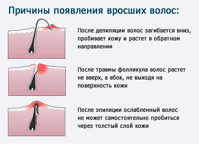 - Врастания. Такой эффект наблюдается при выщипывании. Нужно соблюдать технологию процедуры, хотя, к сожалению, это не может стопроцентно обезопасить от вросших волосков.