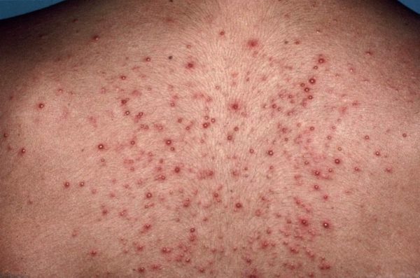Точечная мелкая сыпь – результат аллергической реакции кожи или же проявления проблем с кровеносной системой. Она может появиться и в результате трения одежды о кожу, в результате несоблюдения правил гигиены и т. д. Красная сыпь на спине – обычно проявление аллергий. Она часто чешется, человек может испытывать жжение. Также важно помнить, что такая сыпь проявляется при сифилисе, грибке и т. д.