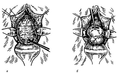 - Метод Пальмера: трахелоистмикопластика — рассечение стенки влагалища, смещение мочевого пузыря, иссечение овального лоскута в зоне истмуса и наложение швов из хромированного кетгута без повреждения цервикального канала.