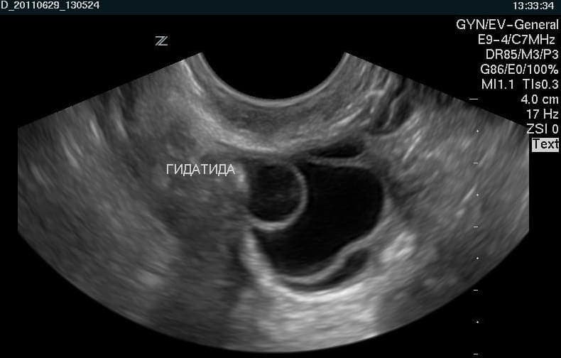 Гидатида яичника – это остаток эмбрионального мюллерова протока. Представляет собой полость размерами 2-8 мм с четкими ровными контурами. Гидатида соединена с яичником тонкой ножкой. Внутри образование содержит прозрачную серозную жидкость.
