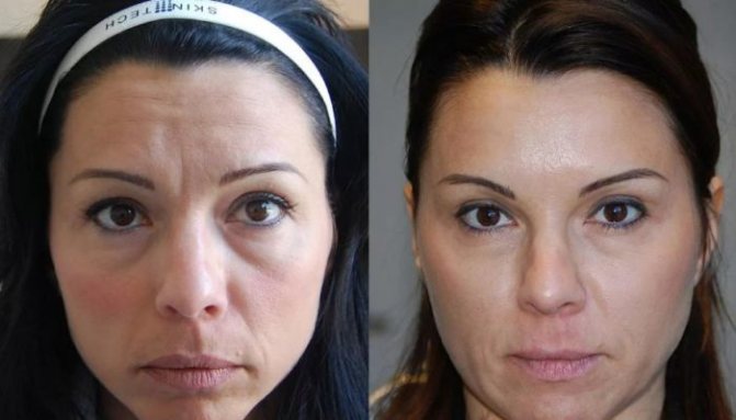 Это введение под кожу специальными иглами в мимические мышцы нейротоксина типа «А» белковой природы в микроскопической дозе. Вследствие этого мышцы расслабляются, но не атрофируются, потому что вещество не попадает в кровообращение, кожа приобретает подтянутый вид, а злосчастные бороздки исчезают.