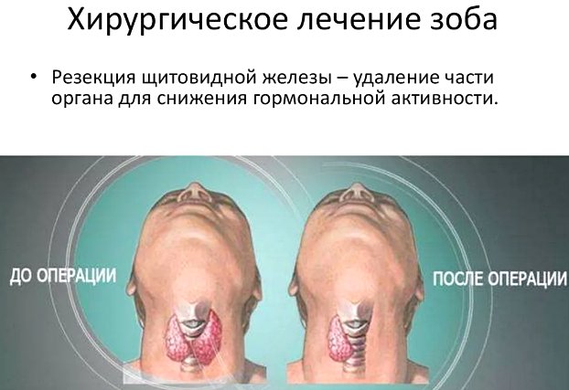 Если эффекта от консервативной терапии не наблюдается, или происходит увеличение в размерах образования в щитовидке, назначается операция с удалением части железы. При этом функция органа, как правило. сохраняется.